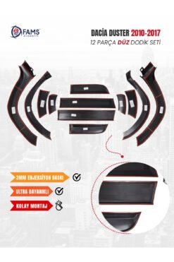 Dacia Duster Uyumlu 12 Parça Abs Dodik Seti 2010-2017 baskısız düz • Ürünümüz, 2010-2017 tüm Dacia Duster modelleriyle birebir uyumludur,; (2010 çıkışlı eski kasa ve 2017 çıkşlı yeni kasalarla uyumlu değildir) • 12 parçadan oluşan set içeriği: – 4 adet yan kapı dodik parçası – 4 adet çamurluk ağzı – 4 adet ek çamurluk ağzı • FAMS OTO AKSESUAR farkı: Ürünümüz, tam otomasyonlu enjeksiyon sistemiyle üretilmiştir,; Bu ileri teknoloji üretim yöntemi sayesinde parçalarda üst düzey dayanıklılık ve darbelere karşı ekstra direnç sağlanmaktadır,; Sadece estetik bir aksesuar değil, aynı zamanda araç koruma ürünü olarak da görev yapar,; • Duster kapı koruma dodik seti , 33mm kalınlığında PPC yüksek mukavemetli yapıdadır,; • Duster dodik çamurluk kenarları lastik ile uyum sağlar Montaj öncesinde aracın yüzeyi mutlaka temizlenmeli, kimyasal içeren temizlik ürünleri kullanılmamalıdır,; Temizlenen zemin ürün ile birlikte gönderdiğimiz Primer mendil ile silinerek ürün yapıştırılmalıdır • OEM kalitesinde yerli üretim ABS plastik malzeme kullanılmıştır,; • Montaj sonrası ilk 24 saat araç yıkanmamalı, basınçlı suyla temas ettirilmemelidir,; Montaj Talimatları; • Duster kapı koruma dodik seti içerisinde yer alan yüksek kaliteli çift taraflı bantlar sayesinde hızlı ve kolay montaj yapılabilir,; • Araç üzerinde delme, kesme veya tadilat işlemi gerektirmez,; • Dodikler, lastik kenarlarıyla tam uyum sağlar; hem şık bir görünüm kazandırır hem de darbelere karşı etkili koruma sunar,; • Siyah silikon kullanımı, kapı kenarlarında uzun ömürlü ve sağlam bir montaj için önerilir,; Enjeksiyon Baskı PPC 3mm Yüksek Dayanıklı malzemeden üretilmiştir