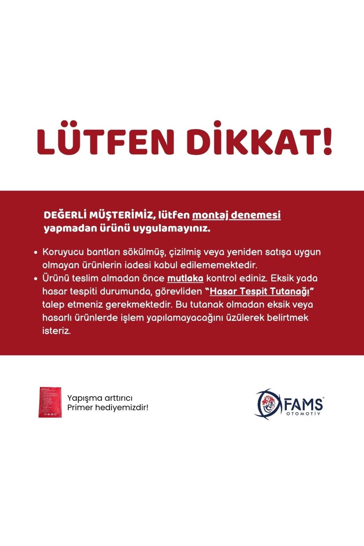 Renault Duster 2024 Üzeri Için Krom Cam Alt Çıtası 6 Parça Paslanmaz Çelik Renault Duster 2024 modelleri için özel olarak tasarlanmış, 6 parçadan oluşan krom cam alt çıtası ile aracınızın şıklığını artırın.; Paslanmaz çelik malzeme sayesinde uzun ömürlü ve dayanıklı kullanım sunar, paslanma ve korozyona karşı dirençlidir.; Araç markası ve modeli ile tam uyum sağlayan tasarım, kolay montaj imkanı sağlar ve estetik bir görünüm kazandırır.; Yapıma arttırıcı primer mendil hediye FAMS OTO AKSESUAR GÜVENCESİYLE – GENEL ÜRÜN BİLGİLENDİRME METNİ 🔔 DİKKAT! Değerli müşterimiz, ürününüzü araca uygulamadan önce kesinlikle ürünün yönlerini doğru uygulamak amacıyla montaj denemesi yapmadan yerleşimini kontrol ediniz.; Ürününüzün doğru şekilde uygulanması, hem kullanım ömrünü hem de estetik görünümünü doğrudan etkilemektedir.; Yanlış yapılan montaj sonrasında sök-tak yapılan ürünler yapışkan özelliğini kaybetmektedir.; Bu nedenle bu tür durumlarda ürün hasarlı olarak değerlendirilip maalesef iadesi kabul edilememektedir.; 🔍 ÜRÜN DETAYLARI • Oto Krom Aksesuarımız, 3D kalıplama teknolojisiyle üretilmiş olup aracınızın hatlarına mükemmel uyum sağlar.; • Krom ürünler A sınıfı A 304 kalite paslanmaz çelikten üretilmektedir.; • Paslanmaz çelik yapısı sayesinde dış etkenlere karşı maksimum dayanıklılık gösterir, uzun süre boyunca ilk günkü parlaklığını ve formunu korur.; • Bu ürün, estetik ve koruyucu amaçlı geliştirilmiş bir aksesuar ürünü olup, oto yedek parçası değildir.; 🛡️ GARANTİ KOŞULLARI • Tüm krom ürünlerimiz, doğru montaj yapıldığı takdirde 2 yıl garantilidir.; • Montaj hatalarından kaynaklı deformasyonlar garanti kapsamı dışındadır.; 📦 GÖNDERİM ve PAKETLEME BİLGİLERİ • Siparişleriniz, en geç 3 iş günü içerisinde anlaşmalı kargo firmaları aracılığıyla adresinize gönderilir.; • Tüm ürünler, taşıma sürecinde deformasyona karşı özel olarak paketlenmektedir.; 🔒 Teslimat Anında Dikkat Edilmesi Gerekenler: Kargonuzu mutlaka kargo görevlisinin önünde kontrol ediniz.; Herhangi bir hasar, eksik parça ya da sorun olması halinde mutlaka “Hasar Tespit Tutanağı” düzenlettiriniz.; (hasar tespit tutanağı olmayan hasarlı iadeler maalesef kabul edilememektedir.; ) Koruyucu bandı sökülmüş, çizilmiş veya yeniden satışa uygun olmayan ürünlerin iadesi kabul edilmemektedir.; 🛠️ MONTAJ BİLGİLERİ • Montaj işlemi son derece kolaydır; ekstra profesyonel destek gerekmez.; • Uygulama yapılacak yüzeyin temizliği önemlidir.; Ürün ile birlikte gönderdiğimiz Primer mendil ile veya tiner, alkol, ispirto ile yüzeyi temizleyin ve tamamen kurumasını bekleyin.; • Ürünün iç yüzeyindeki çift taraflı bandı sökmeden önce parçayı aracınızda prova ediniz.; • Bandı söktükten sonra montaj öncesinde hafifçe ısıtarak (örneğin saç kurutma makinesi ile) yapışma gücünü artırabilirsiniz.; • Montaj sonrası 24 saat boyunca aracınızı yıkamayınız ve basınçlı suyla temas ettirmeyiniz.; 💬 SORULARINIZ MI VAR? Bizimle iletişime geçmekten çekinmeyin.; FAMS OTO AKSESUAR olarak memnuniyetiniz bizim için her şeyden önemli!