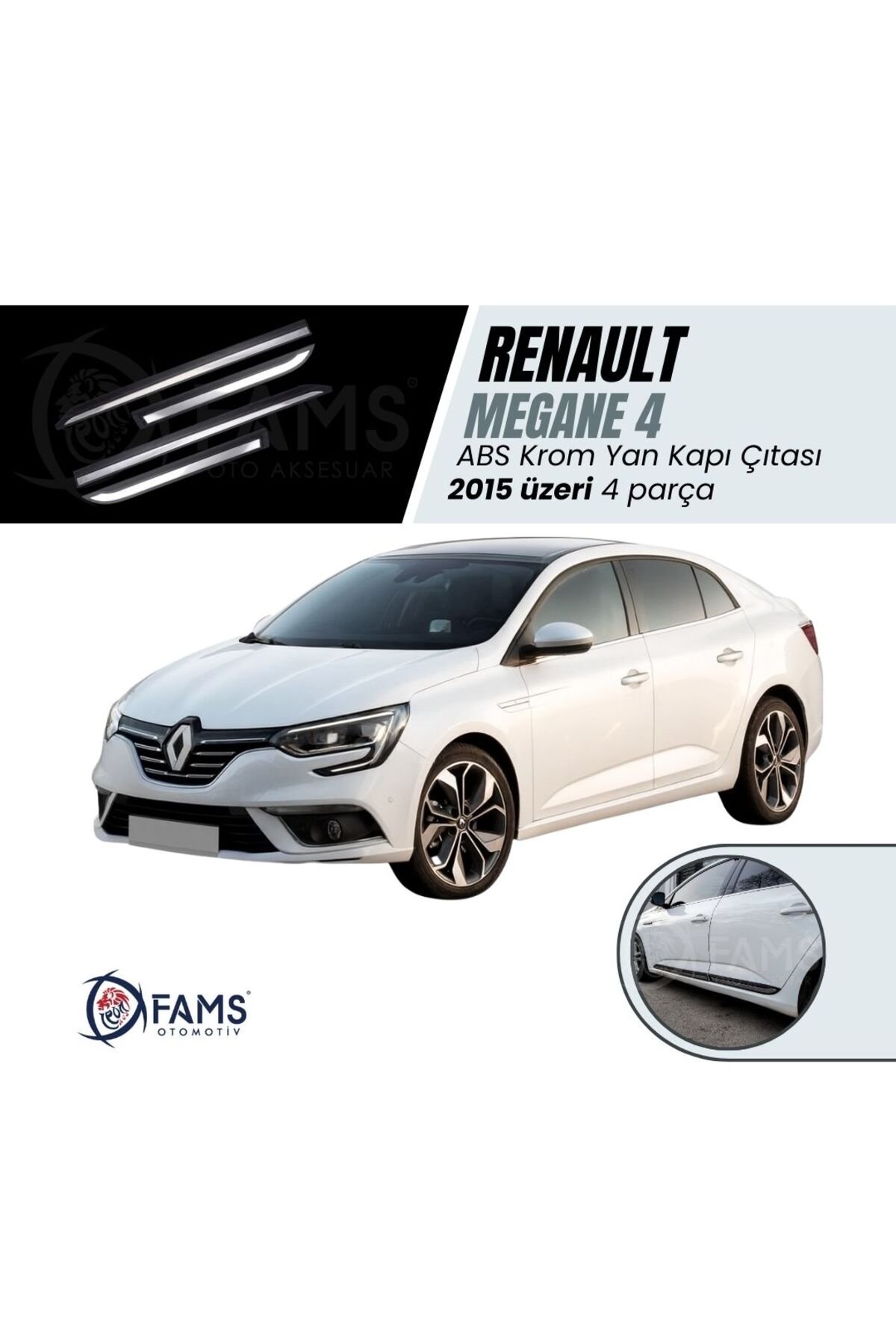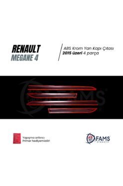 - Renault Megane 4 Sedan aracınıza şık, koruyucu ve premium bir dış görünüm kazandıran krom + ABS yan kapı çıtası seti, 2015 ve üzeri Megane 4 Sedan modelleriyle birebir uyumlu olarak üretilmiştir.