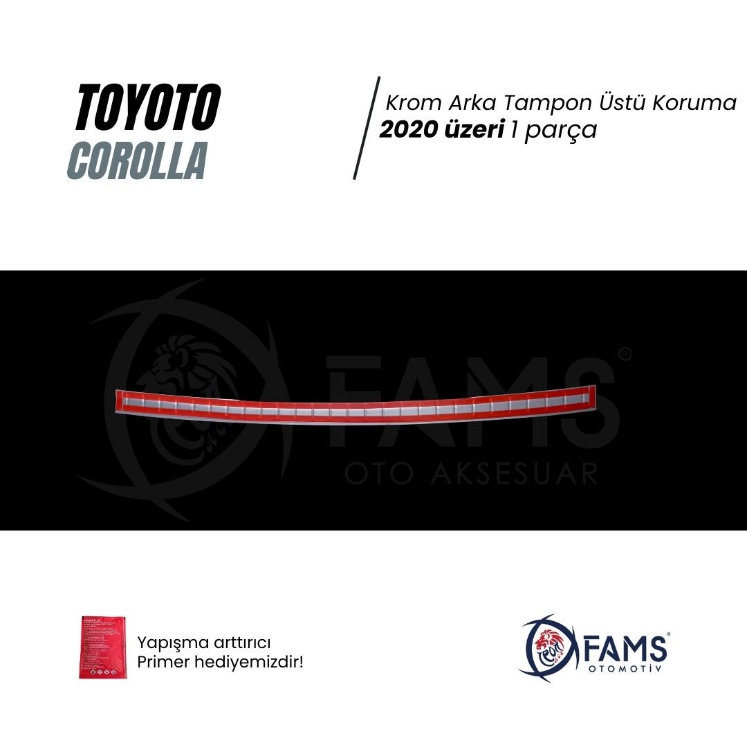 - Toyota Corolla Sedan aracınıza şık görünüm ve ekstra koruma kazandıran krom arka tampon üstü koruma çıtası, 2020 ve üzeri kasa Corolla Sedan modelleriyle birebir uyumlu olarak üretilmiştir.