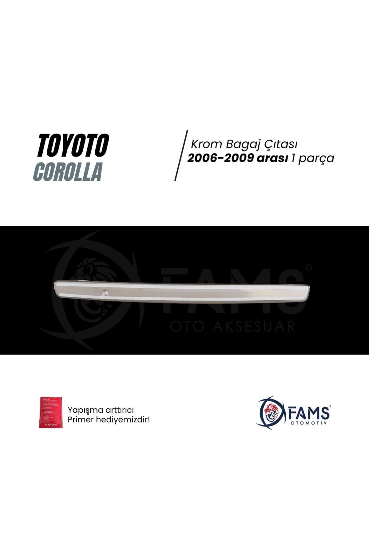Toyota Corolla Krom Bagaj Çıtası 2006-2009 Ve Üzeri P.; çelik Toyota Corolla 2006-2009 ve üzeri modeller için özel olarak tasarlanmış, aracınızın dış görünümünü zenginleştiren krom bagaj çıtası.; Bagaj bölgenize modern bir dokunuş katarak, aracınızın şıklığını ve estetiğini artırır.; Dayanıklı p.; çelik malzeme kullanımı sayesinde uzun ömürlü ve sağlam bir yapı sunar.; Uzun tasarım özelliği ile bagaj kapaklarının üst kısmını tamamen kaplayarak, hava direncini azaltır ve yakıt verimliliğine katkıda bulunur.; Yapışma arttırıcı primer mendil hediye.; FAMS OTO AKSESUAR GÜVENCESİYLE – GENEL ÜRÜN BİLGİLENDİRME METNİ 🔔 DİKKAT! Değerli müşterimiz, ürününüzü araca uygulamadan önce kesinlikle ürünün yönlerini doğru uygulamak amacıyla montaj denemesi yapmadan yerleşimini kontrol ediniz.; Ürününüzün doğru şekilde uygulanması, hem kullanım ömrünü hem de estetik görünümünü doğrudan etkilemektedir.; Yanlış yapılan montaj sonrasında sök-tak yapılan ürünler yapışkan özelliğini kaybetmektedir.; Bu nedenle bu tür durumlarda ürün hasarlı olarak değerlendirilip maalesef iadesi kabul edilememektedir.; 🔍 ÜRÜN DETAYLARI • Oto Krom Aksesuarımız, 3D kalıplama teknolojisiyle üretilmiş olup aracınızın hatlarına mükemmel uyum sağlar.; • Krom ürünler A sınıfı A 304 kalite paslanmaz çelikten üretilmektedir.; • Paslanmaz çelik yapısı sayesinde dış etkenlere karşı maksimum dayanıklılık gösterir, uzun süre boyunca ilk günkü parlaklığını ve formunu korur.; • Bu ürün, estetik ve koruyucu amaçlı geliştirilmiş bir aksesuar ürünü olup, oto yedek parçası değildir.; 🛡️ GARANTİ KOŞULLARI • Tüm krom ürünlerimiz, doğru montaj yapıldığı takdirde 2 yıl garantilidir.; • Montaj hatalarından kaynaklı deformasyonlar garanti kapsamı dışındadır.; 📦 GÖNDERİM ve PAKETLEME BİLGİLERİ • Siparişleriniz, en geç 3 iş günü içerisinde anlaşmalı kargo firmaları aracılığıyla adresinize gönderilir.; • Tüm ürünler, taşıma sürecinde deformasyona karşı özel olarak paketlenmektedir.; 🔒 Teslimat Anında Dikkat Edilmesi Gerekenler: Kargonuzu mutlaka kargo görevlisinin önünde kontrol ediniz.; Herhangi bir hasar, eksik parça ya da sorun olması halinde mutlaka “Hasar Tespit Tutanağı” düzenlettiriniz.; (hasar tespit tutanağı olmayan hasarlı iadeler maalesef kabul edilememektedir.; ) Koruyucu bandı sökülmüş, çizilmiş veya yeniden satışa uygun olmayan ürünlerin iadesi kabul edilmemektedir.; 🛠️ MONTAJ BİLGİLERİ • Montaj işlemi son derece kolaydır; ekstra profesyonel destek gerekmez.; • Uygulama yapılacak yüzeyin temizliği önemlidir.; Ürün ile birlikte gönderdiğimiz Primer mendil ile veya tiner, alkol, ispirto ile yüzeyi temizleyin ve tamamen kurumasını bekleyin.; • Ürünün iç yüzeyindeki çift taraflı bandı sökmeden önce parçayı aracınızda prova ediniz.; • Bandı söktükten sonra montaj öncesinde hafifçe ısıtarak (örneğin saç kurutma makinesi ile) yapışma gücünü artırabilirsiniz.; • Montaj sonrası 24 saat boyunca aracınızı yıkamayınız ve basınçlı suyla temas ettirmeyiniz.; 💬 SORULARINIZ MI VAR? Bizimle iletişime geçmekten çekinmeyin.; FAMS OTO AKSESUAR olarak memnuniyetiniz bizim için her şeyden önemli!